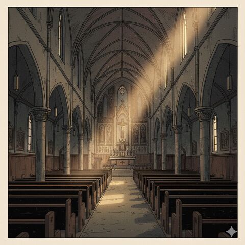 - The Reliquary: A reinforced display case in the narthex containing minor artifacts of the "Hidden War" -- a burnt rosary from the 1944 Schism, a shard of a destroyed Circle of Thorns altar, and other spiritual detritus.