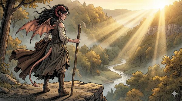Dearest pages; ink scarce as mercy these twenty years, but this ridge; its beauty demands witness. Crested it at dawn, my wings folded tight 'gainst the chill wind, my tail lashing brambles. Tail seemed to stop growing longer. Uncanny thing to have, but I'm learning the use of it. Down below me, I saw a valley sleeping: stream silver-twined through oaks, slopes steep as judgment. My bones ached from this endless journey; and I now choose to claim it. I flashed down in a blink, as I find I can when my destination is close and clear, my misshapen feet sinking in soft loam. I envisioned it then: a cabin, sturdy against storms, a garden like Mother's, no torches, no screams. These horns itch under my hood, and mine eyes glint red in the stream's pools. My devil's blood, in towns they called it. Here, perhaps a forge. But God's? I do not know. Perhaps no other can know the meaning of 'forsaken' as I do, now. The land here quiets my heart. A private peace, safe from prying priests. I will stay. Tomorrow, I will see what the land offers for my home. And if my new fires within serve, not curse.